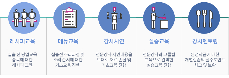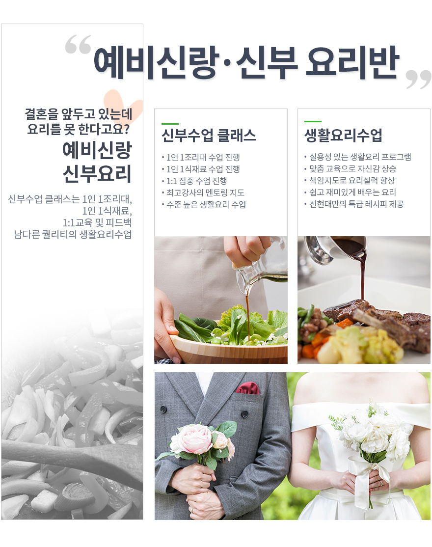 기본기부터 전문기술까지 철저한 실습지도로 신현대가 쉽고 즐거운 요리로 안내합니다.